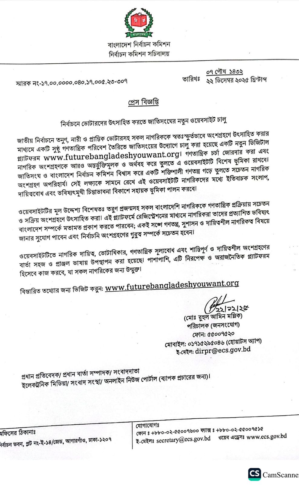 (নং-৩০৭) প্রেস বিজ্ঞপ্তি (নির্বাচনে ভোটারদের উৎসাহিত করতে জাতিসংঘের নতুন ওয়েবসাইট চালু)