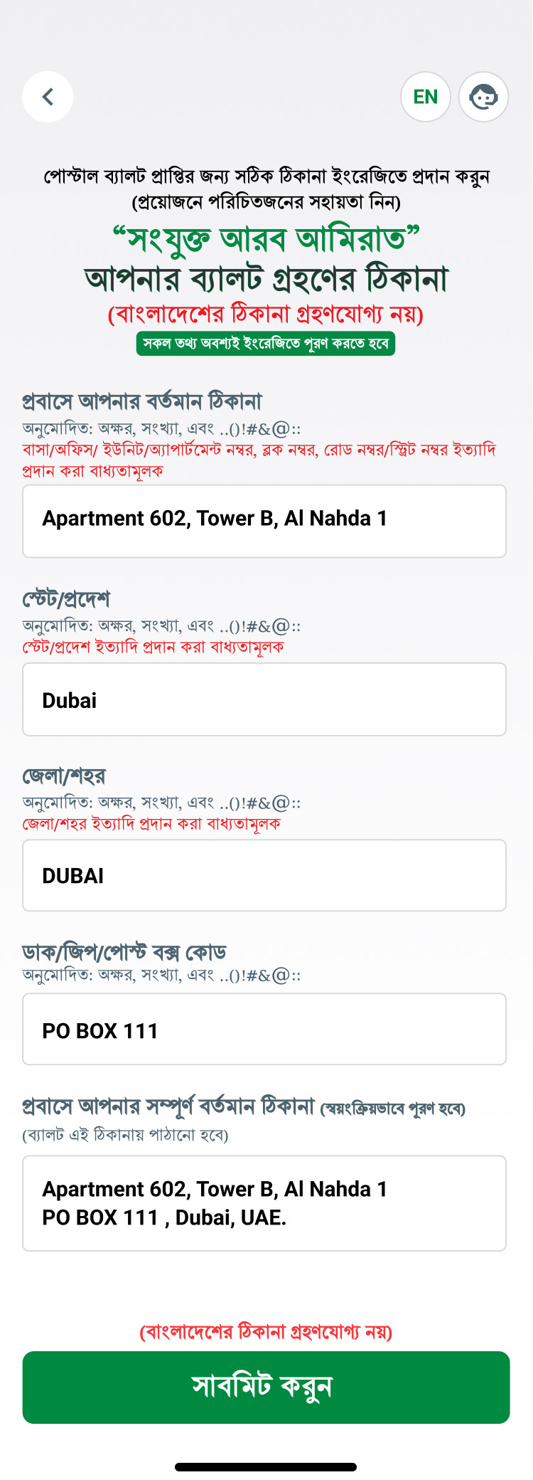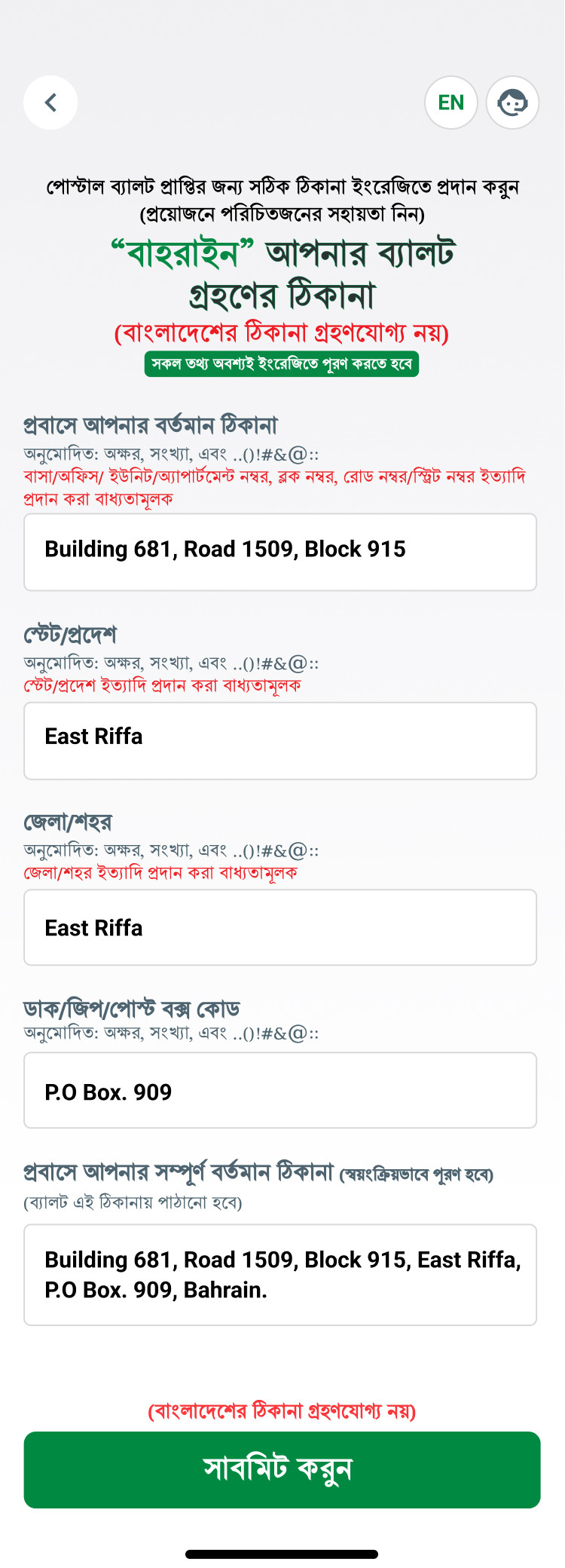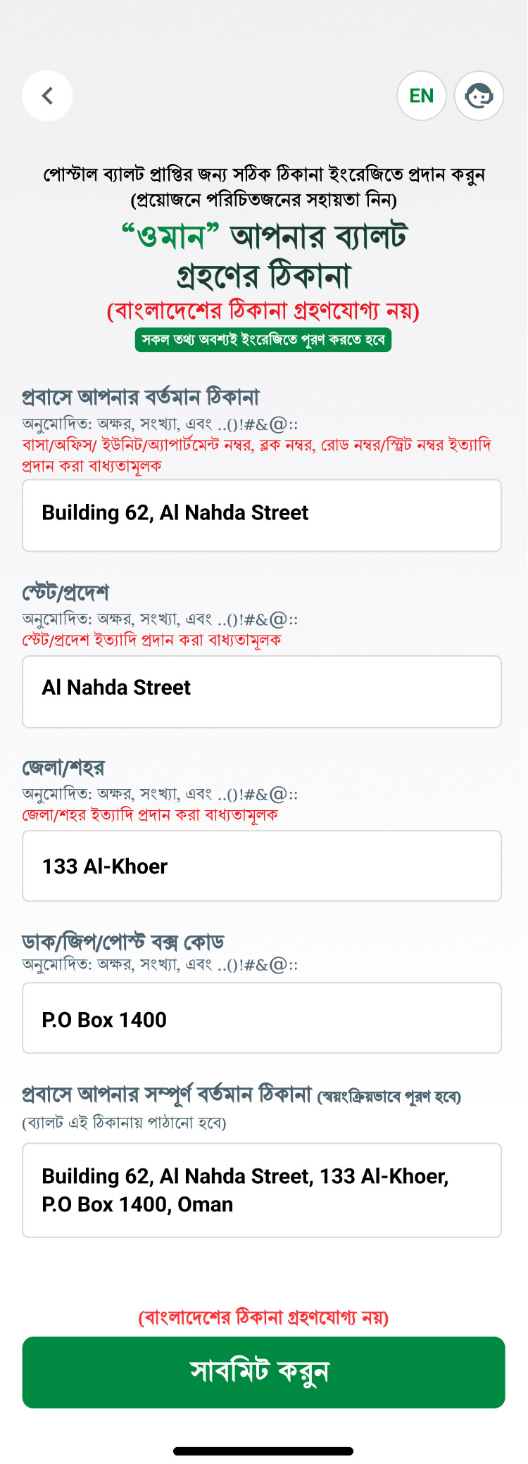 ১. প্রবাসী যে ঠিকানায় বর্তমানে অবস্থান করছেন সে ঠিকানাটি ব্যবহার করা। বাংলাদেশের ঠিকানা (যেমন: ঢাকা, নোয়াখালী, বরিশাল, ইত্যাদি) ব্যবহার না করা।