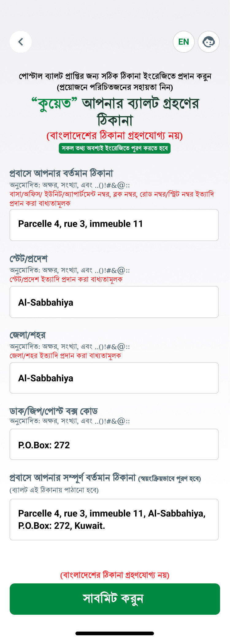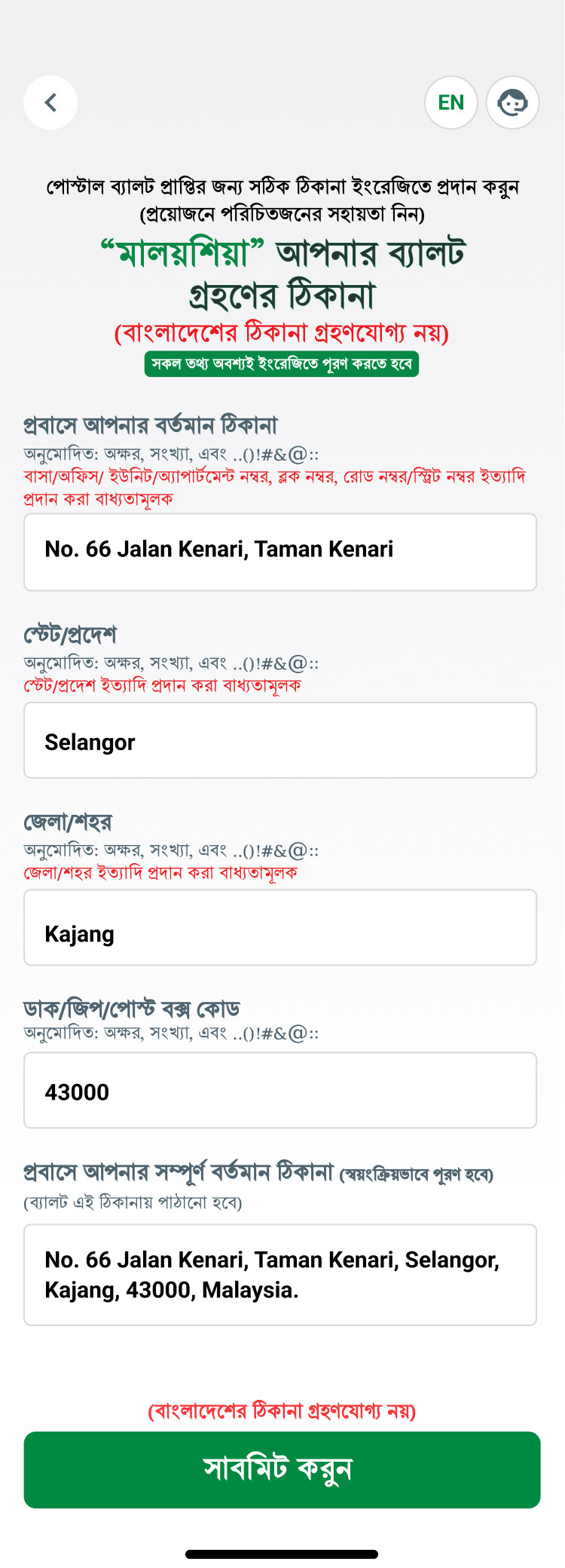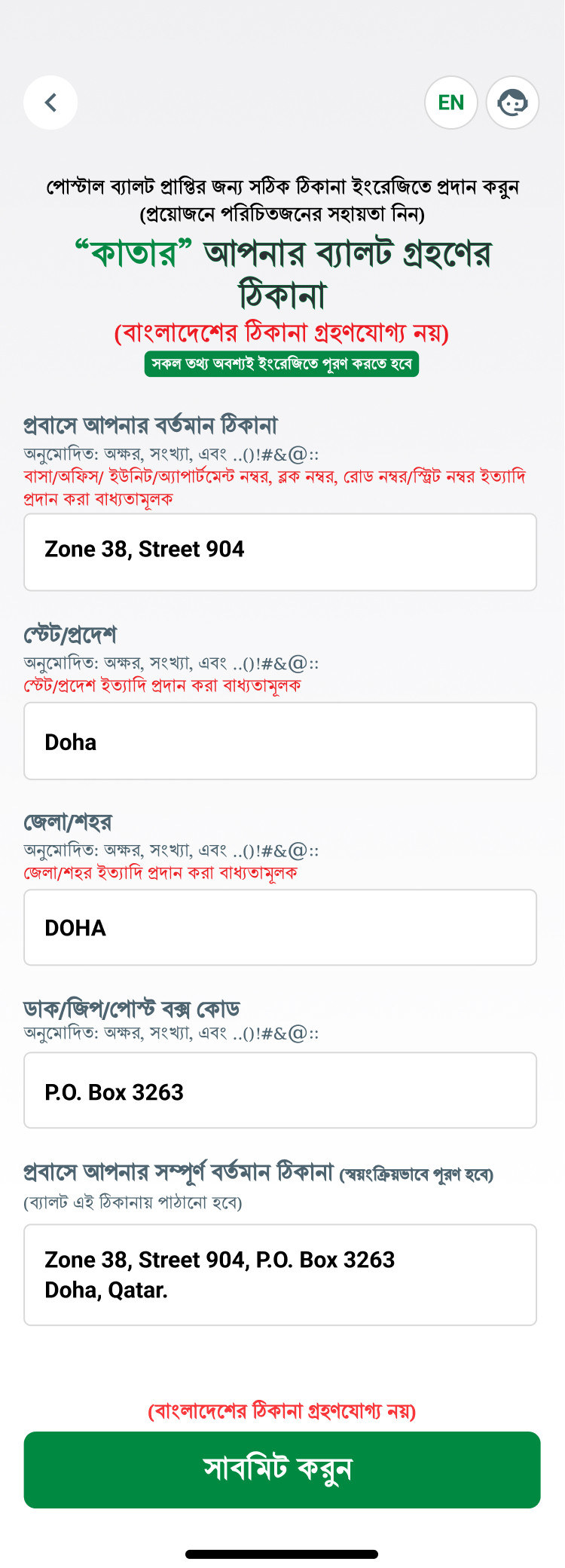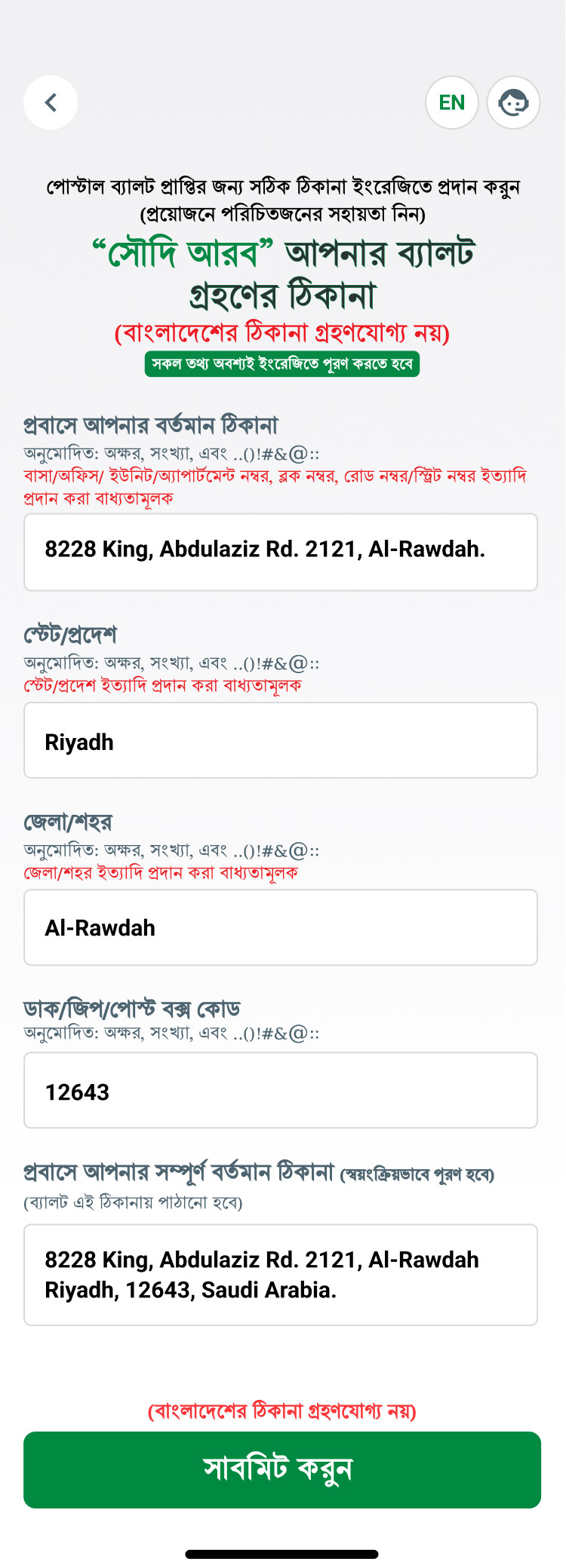 ১. প্রবাসী যে ঠিকানায় বর্তমানে অবস্থান করছেন সে ঠিকানাটি ব্যবহার করা। বাংলাদেশের ঠিকানা (যেমন: ঢাকা, নোয়াখালী, বরিশাল, ইত্যাদি) ব্যবহার না করা।